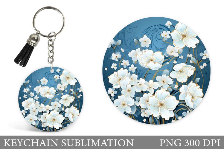 Blue Flowers Round Keychain. White Flowers Keychain Design