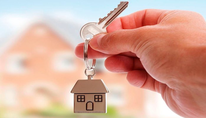 A man dressed in formal attire holds a set of keys with a house-shaped ...