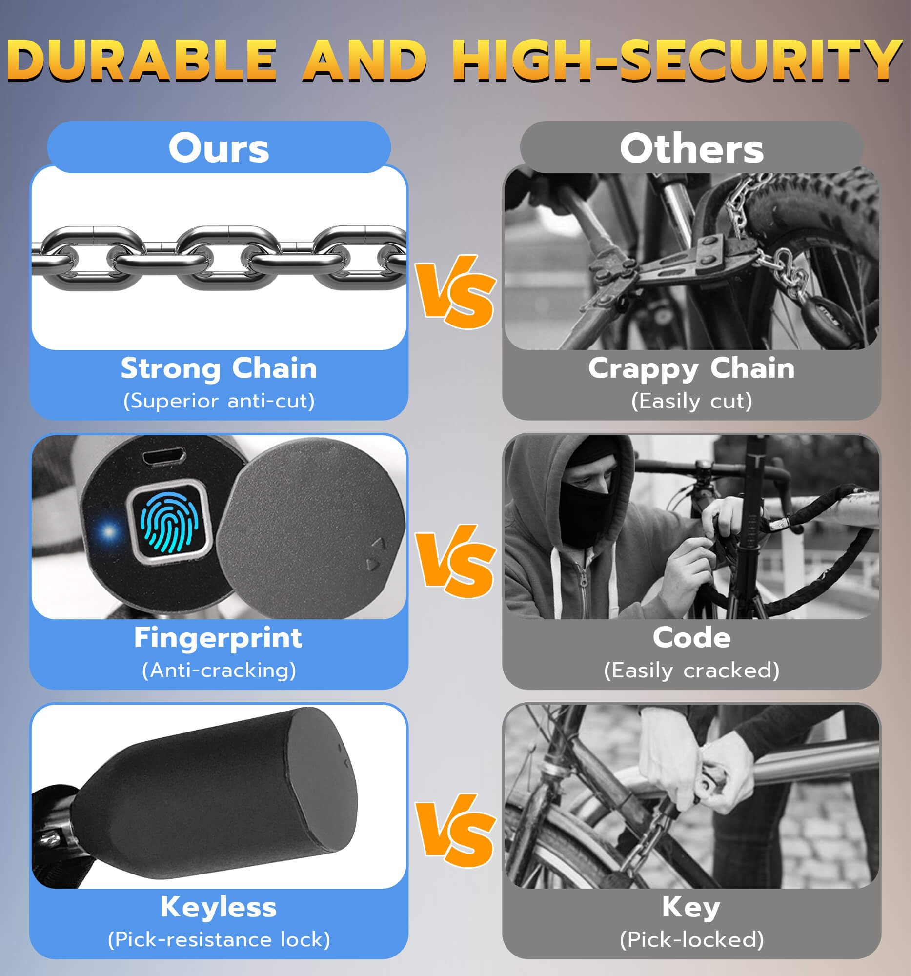 Fingerprint Bike Lock Cable, Keyless Bike Lock Chain Heavy Duty Anti ...