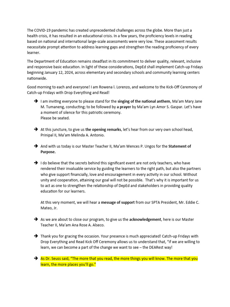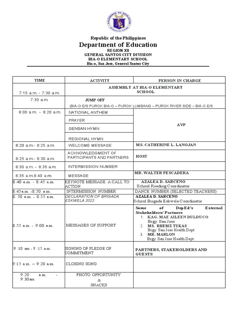 Emcee Script for 2023 Brigada Eskwela Kick-off Program - Studocu