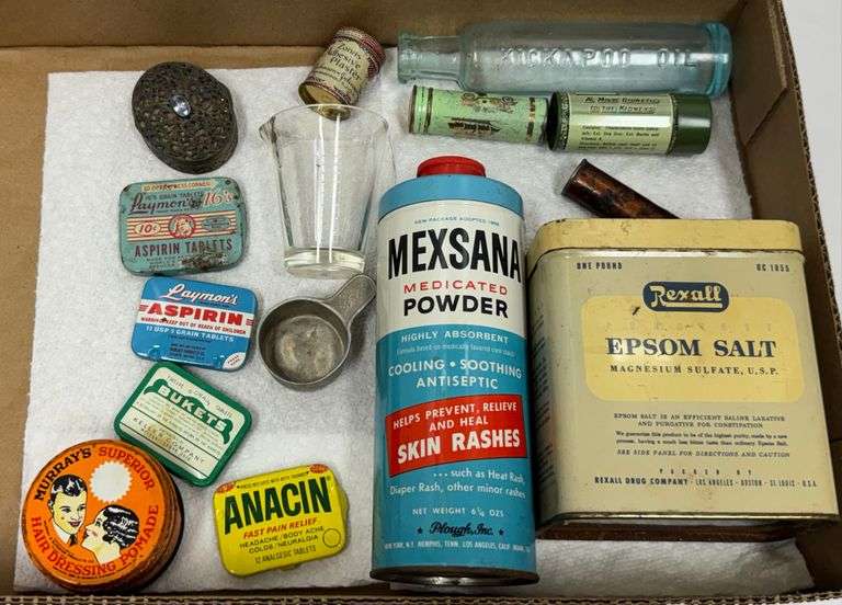 Group of Small Medicine Tins, Kickapoo Oil Bottle, & More - Creamer Auction