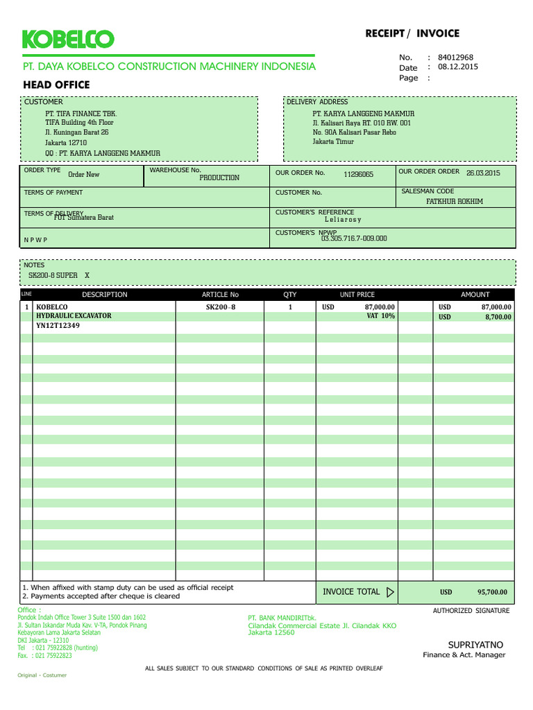 Invoice Kobelco Tifa KLM | PDF