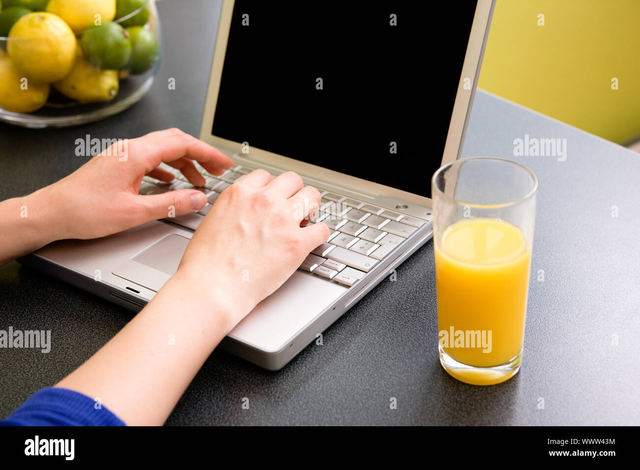 Laptop computer in contemporary upscale home kitchen interior with ...