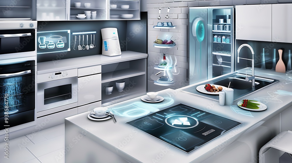 High-tech kitchen with smart appliances, touch-screen controls, and ...