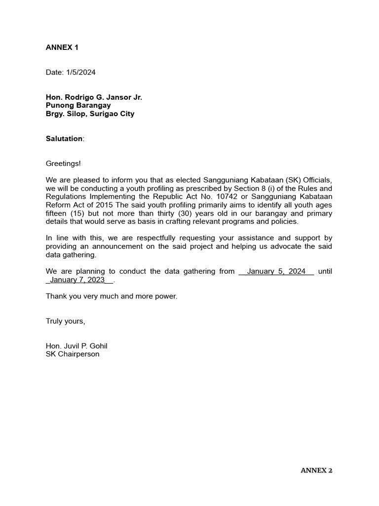 KK Profiling (Annex-1-Letter-to-Punong-Barangay) | PDF