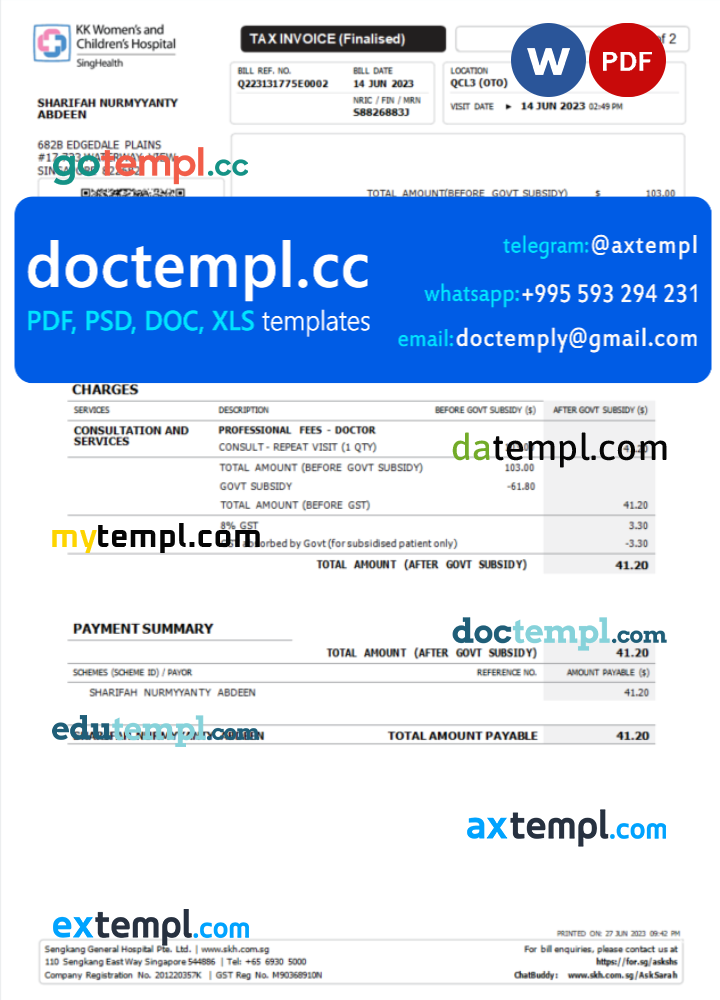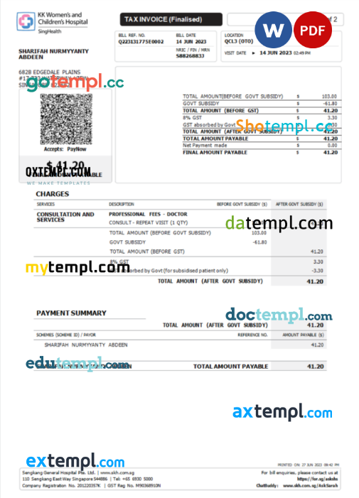Singapore KK Hospital tax invoice Word and PDF template