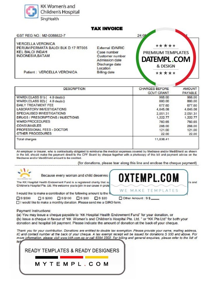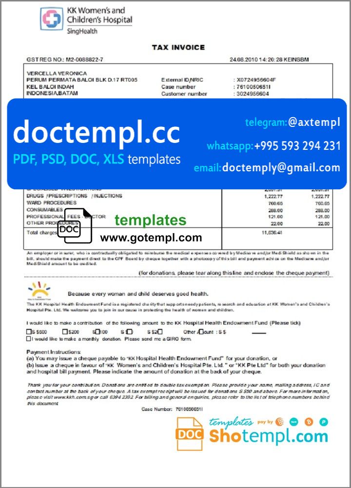 Singapore KK Hospital tax invoice Word and PDF fake template ...