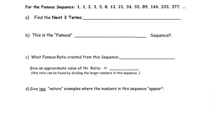 Solved For the Famous Sequence: 1, 1, 2, 3, 5, 8, 13, 21, | Chegg.com