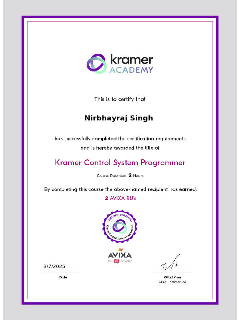 Happy to share with you all my new achievement Kramer Control System ...