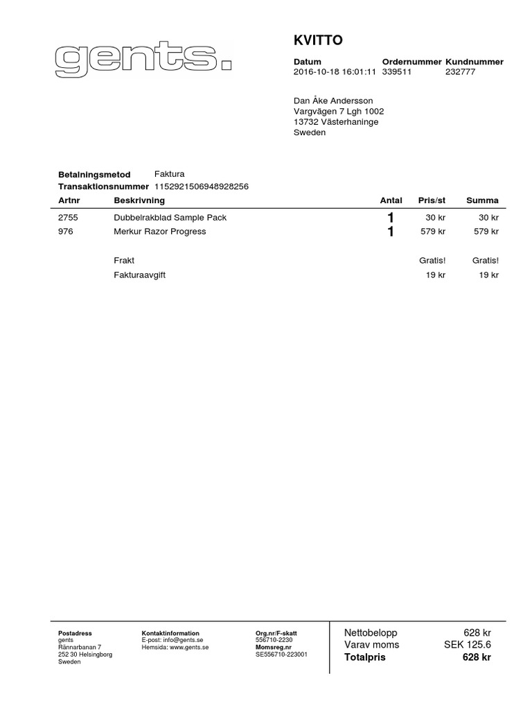 Kvitto: Dina Uppgifter Mottagandedatum Kvittonummer Ordernummer ...
