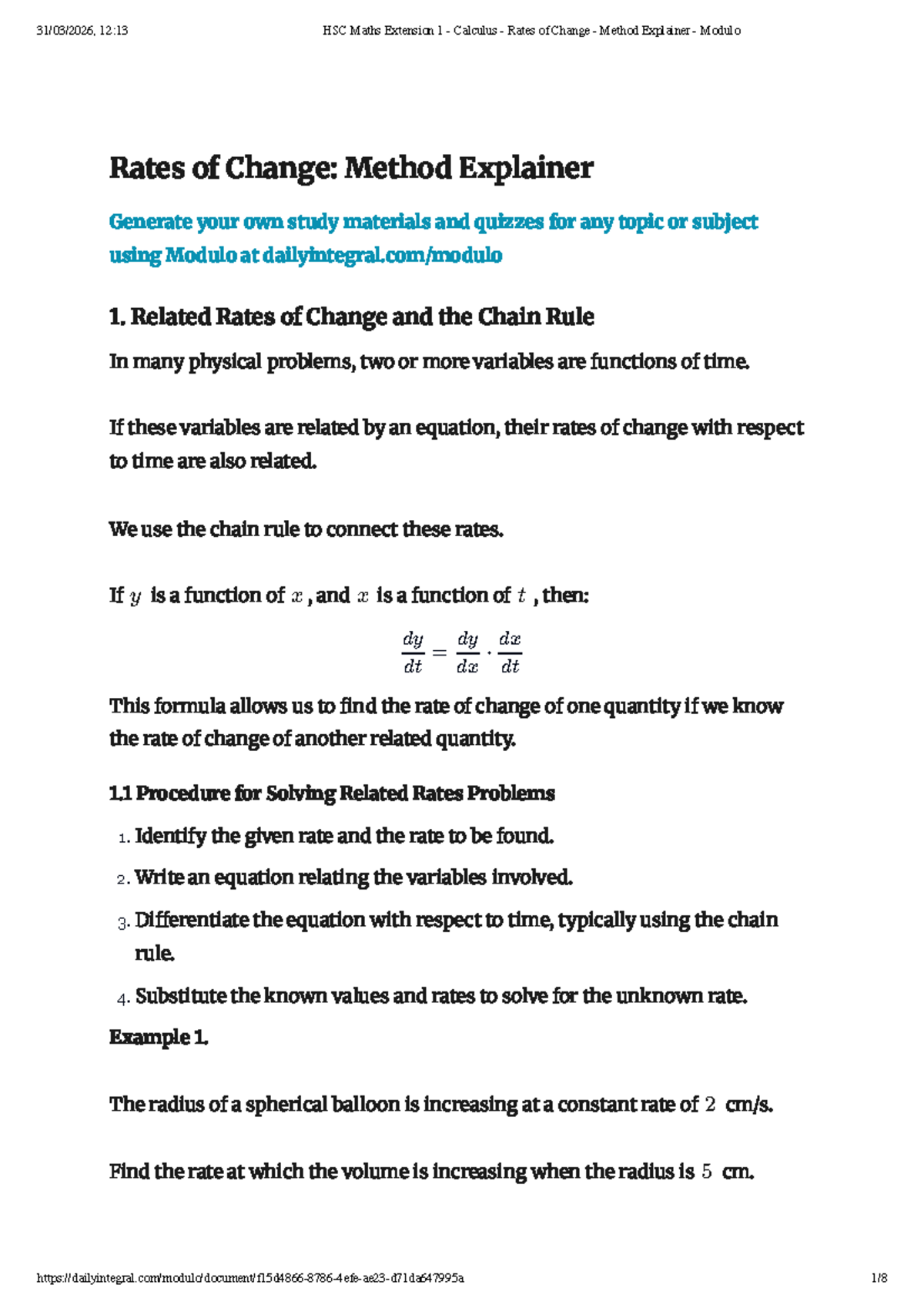 HSC Maths Extension 1: Calculus Rates of Change Method Explainer - Studocu
