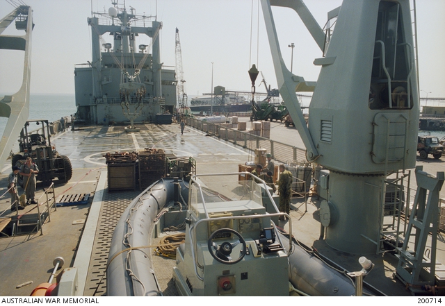 Sailors from HMAS Tobruk (L50) loading goods into a truck beside the ...