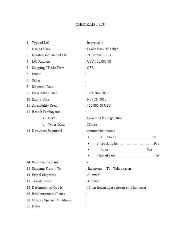 LC (letter of Credit) Document Checklist Form format | Word | PDF | Report