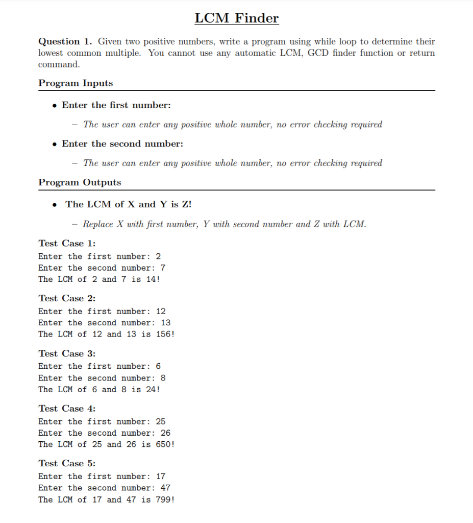 Solved LCM Finder Question 1. Given two positive numbers, | Chegg.com