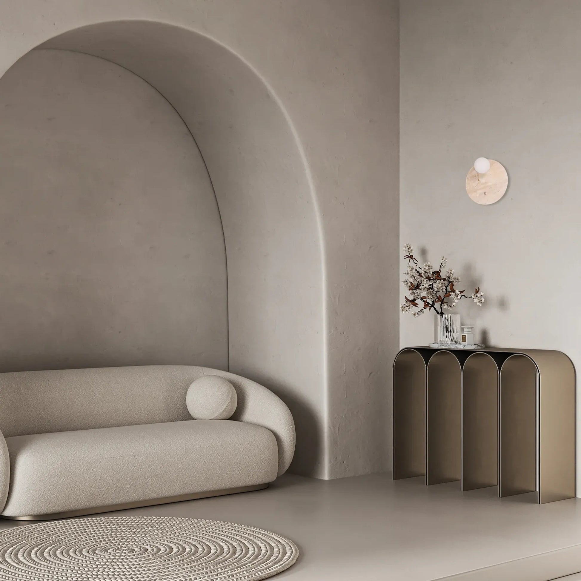 Poi Interior Round Travertine Base Wall Light With Round Opal Diffuser