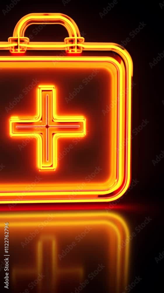 Glowing neon first aid kit sign for medical emergency assistance ...