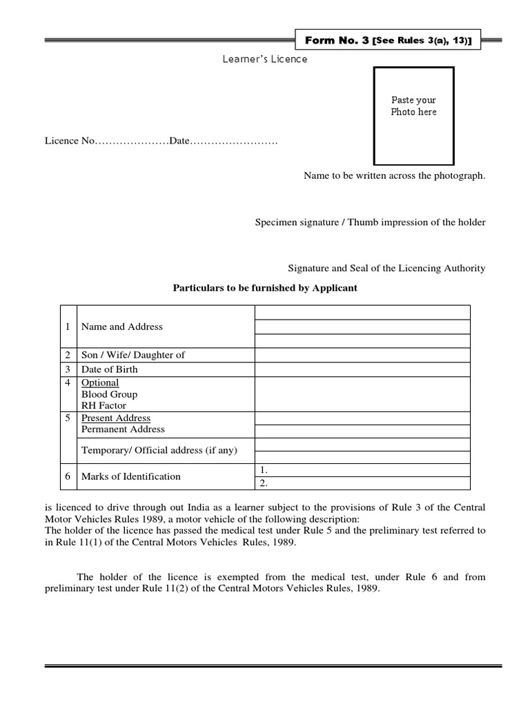 Learner's Licence Form No. 3: Particulars To Be Furnished by Applicant ...