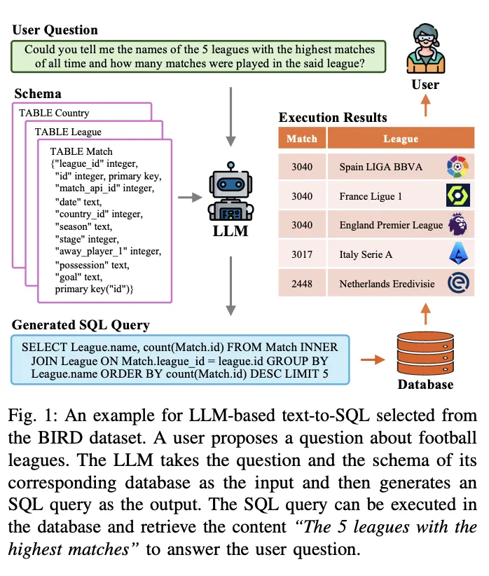 Illustration of a typical LLM-based text-to-SQL workflow, involving ...