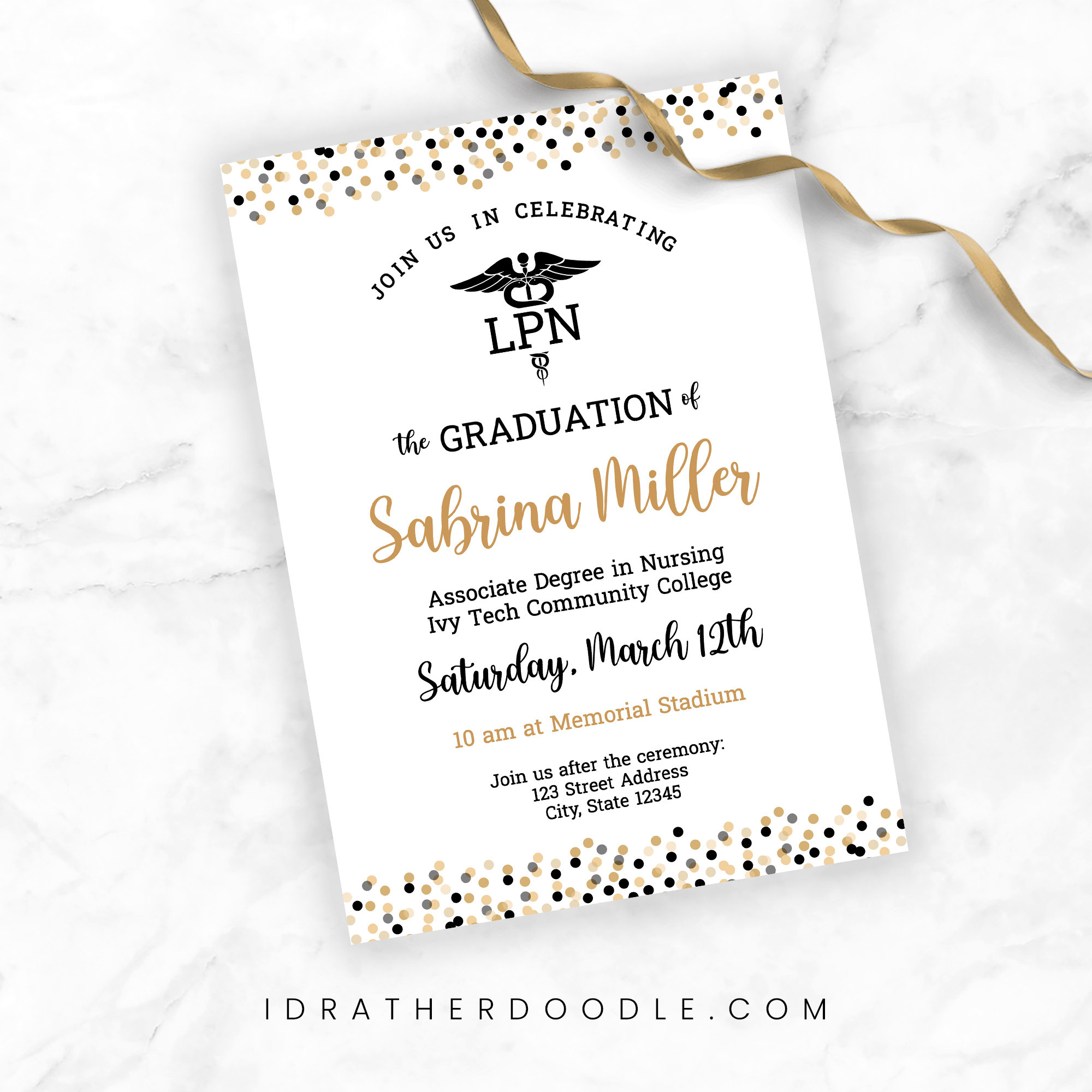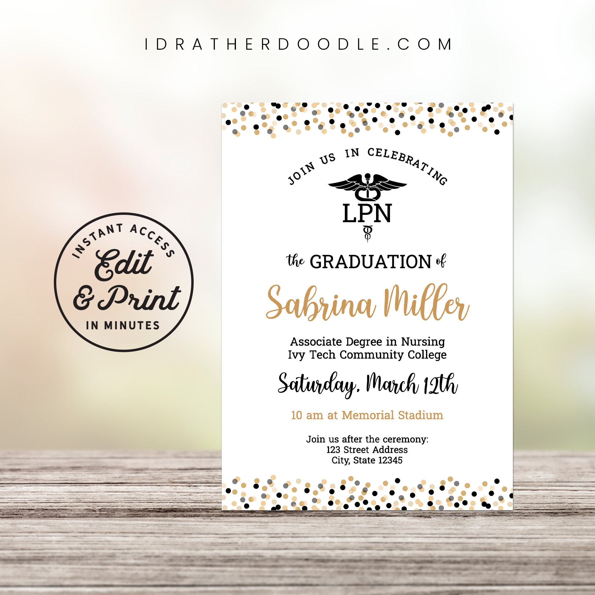Editable LPN Gold Confetti Nursing Graduation Invitation - Nurse ...
