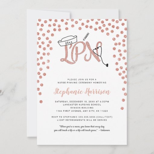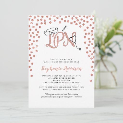 LPN nurse graduation rose gold confetti pinning Invitation | Zazzle