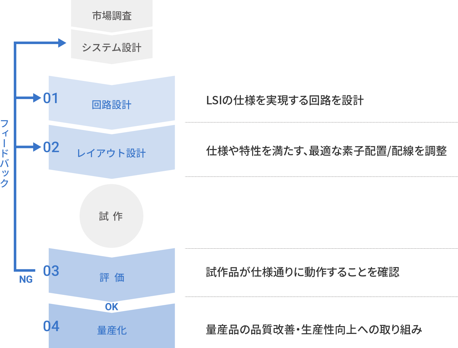 LSIの開発フロー|光半導体デバイス設計製造・LSI設計の九州電子|熊本・九州の光半導体設計・製造|LSI設計・評価