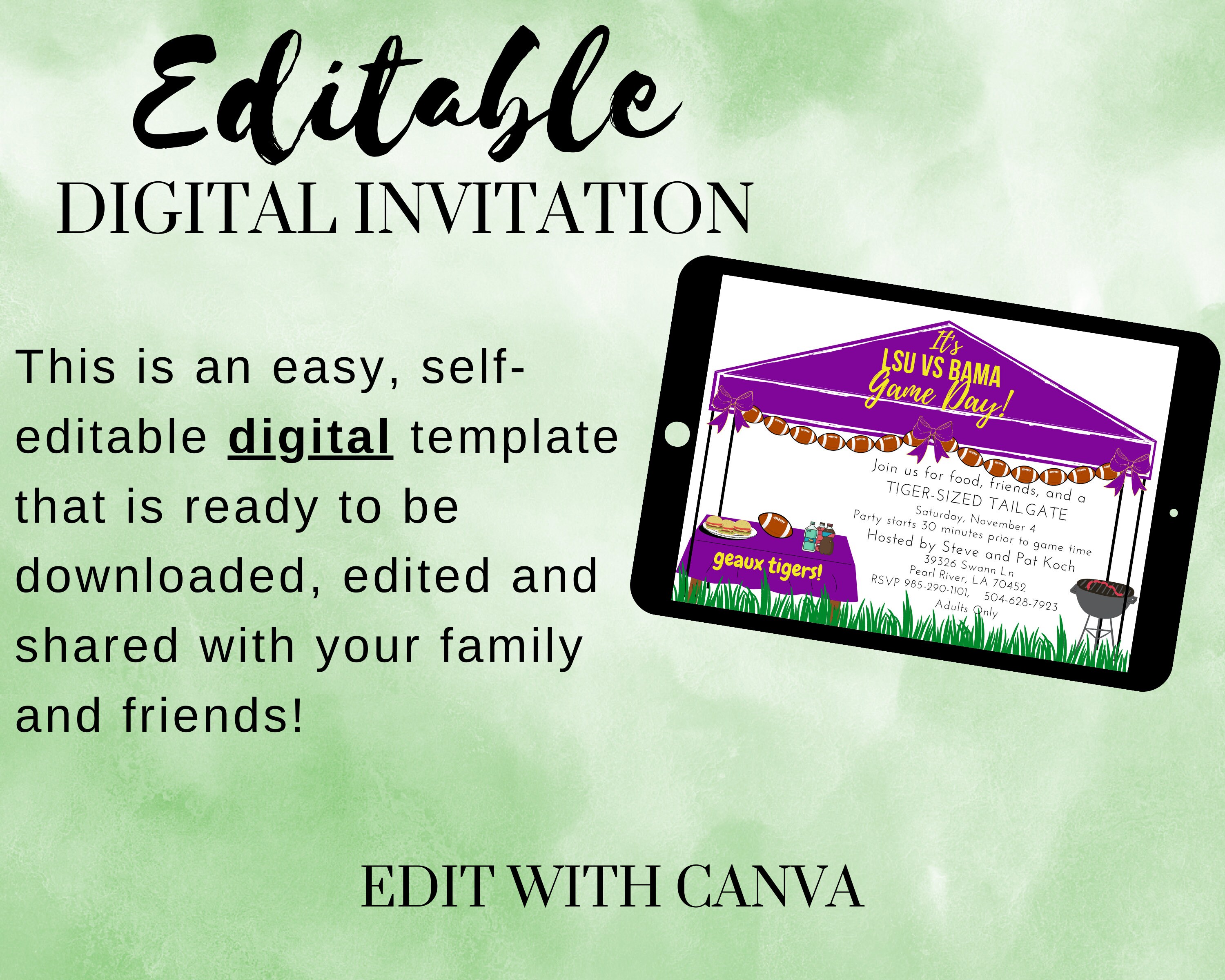 LSU Alabama Football Game Tailgate Invitation Canva Print Edit - Etsy