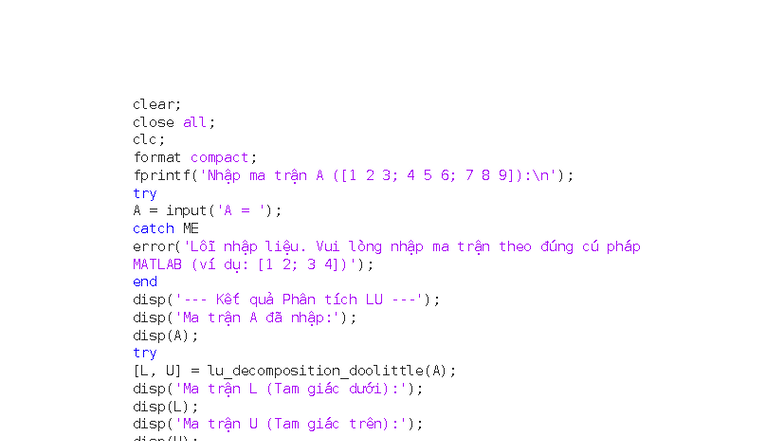 Matlab Code for Solving Linear Equations Using LU Decomposition - Studocu