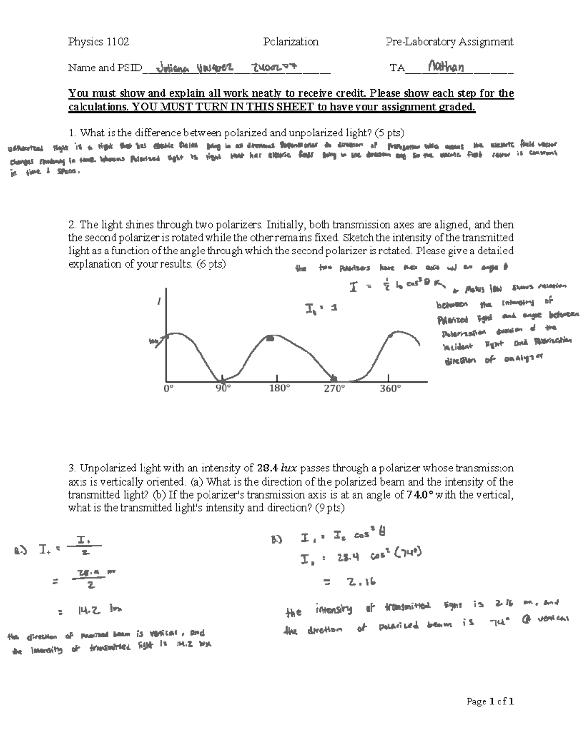 Physics 1102 Polarization Pre-Lab Assignment: Understanding Light ...