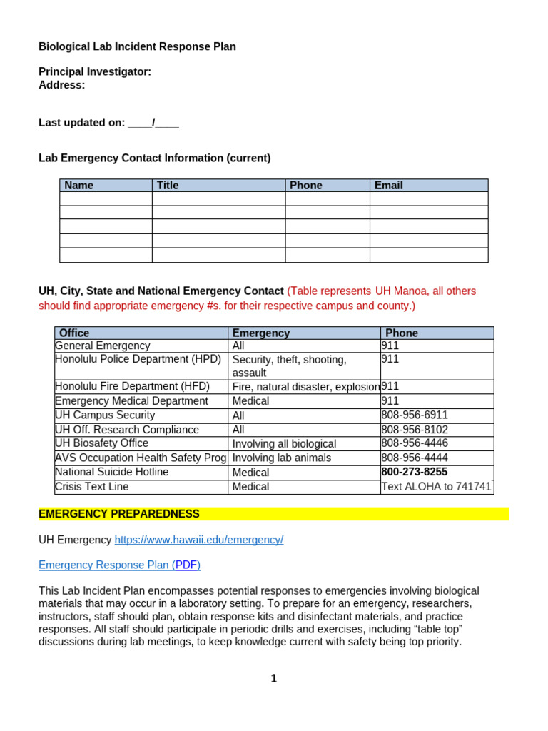Biological Lab Emergency Response Plan | PDF | Emergency Management ...