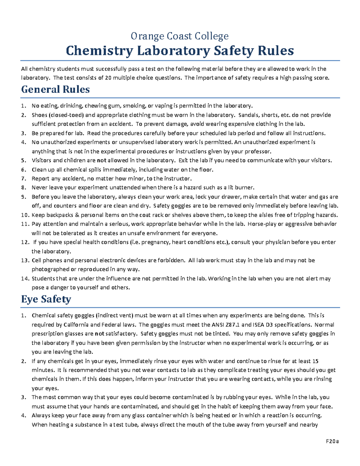 F20a Chemistry Lab Safety Rules - Studocu