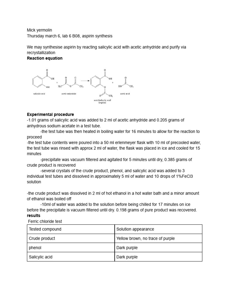 Lab 6 Mick Yermolin, Aspirin Synthesis | PDF | Aspirin | Acid