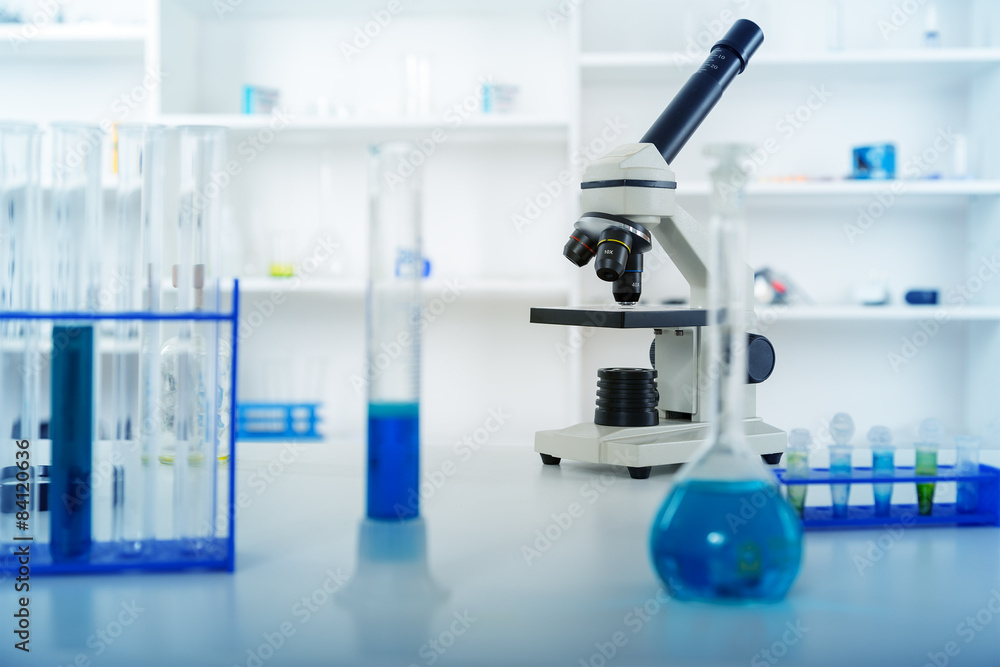 Microscope With Lab Glassware In Modern Medical Laboratory Microscopes ...
