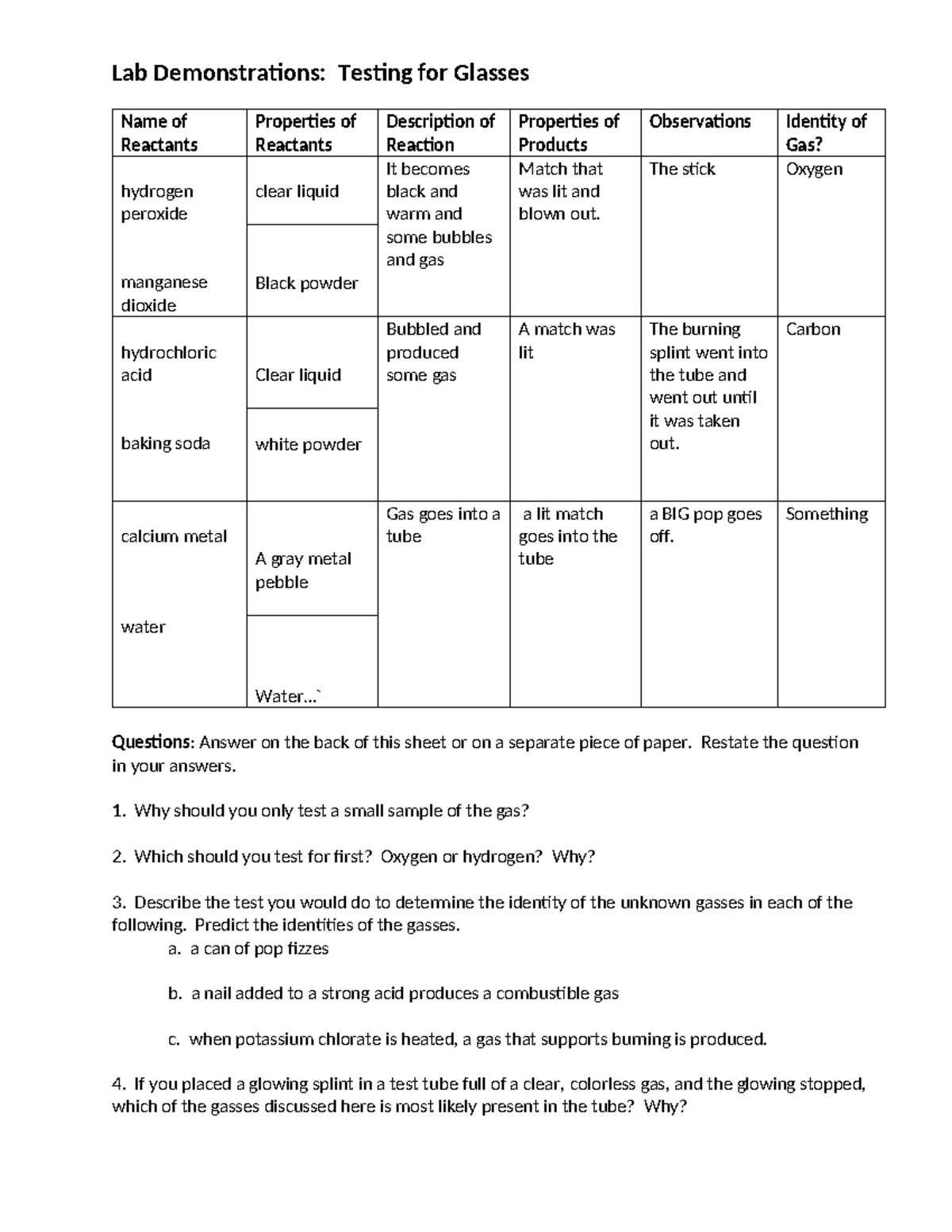 Lab Demonstrations: Testing for Gases in Chemical Reactions - Studocu