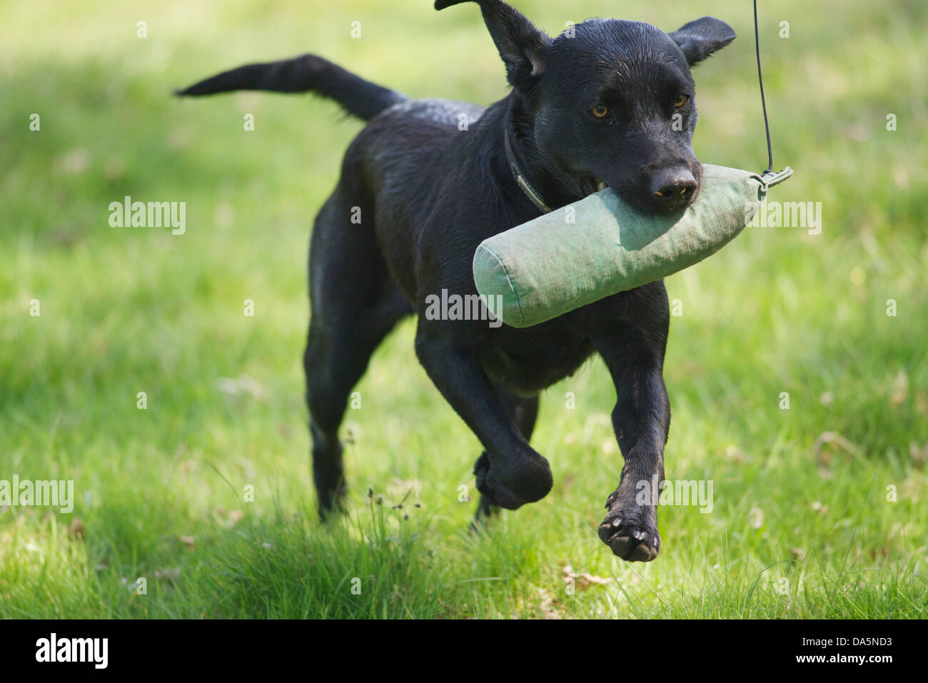 A Black Lab puppy retrieving a training dummy Stock Photo - Alamy