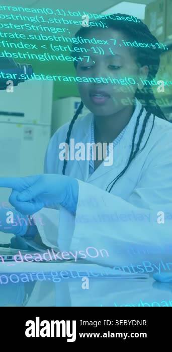 Vertical video: Lab tech tapping tablet while checking data, teal code ...