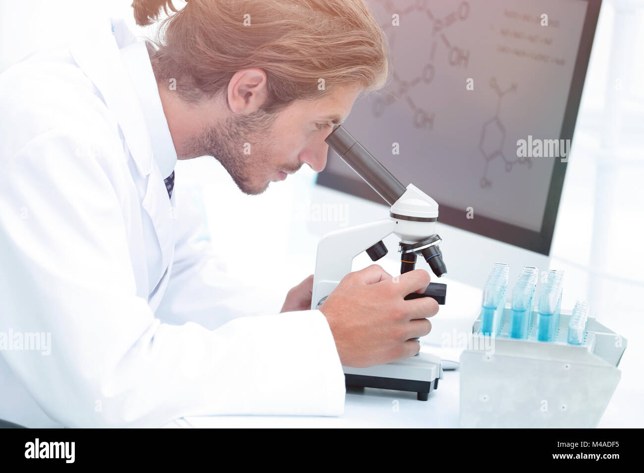 Technician of a laboratory using a microscope in a lab of an hospital ...