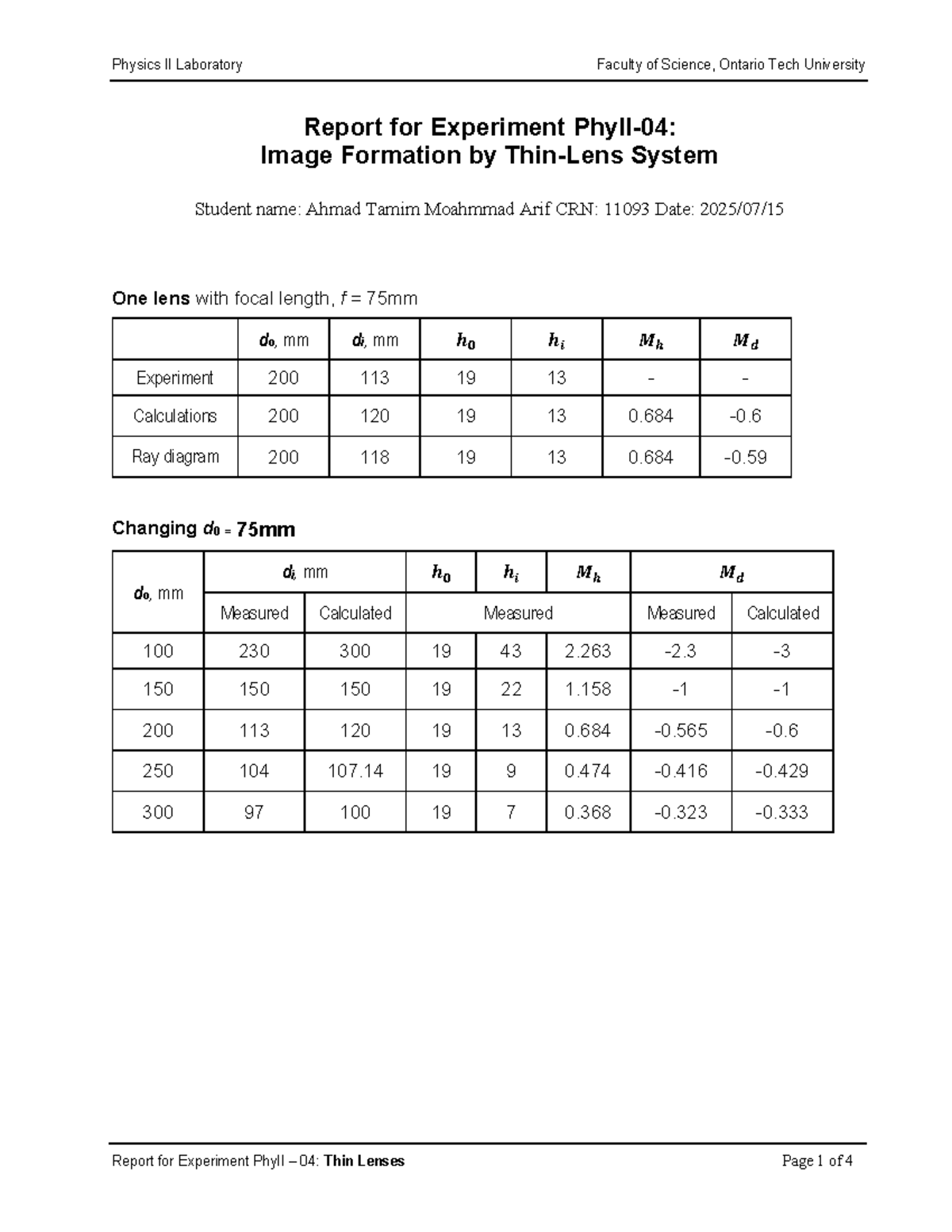 Physics II Lab Report PhyII 04: Thin Lenses Experiment Analysis - Studocu