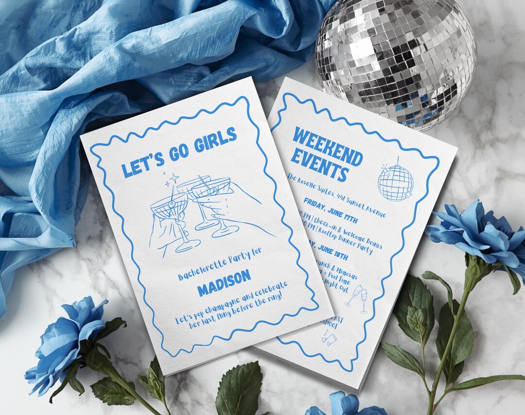 Bachelorette Party Invitation Set | Retro Blue Disco Weekend Itinerary ...