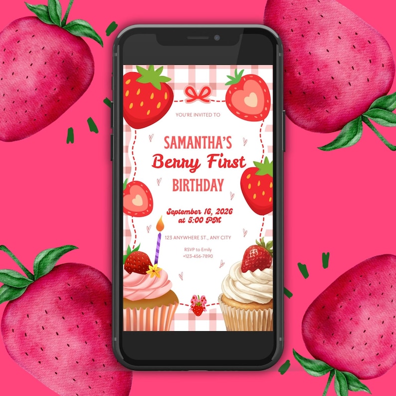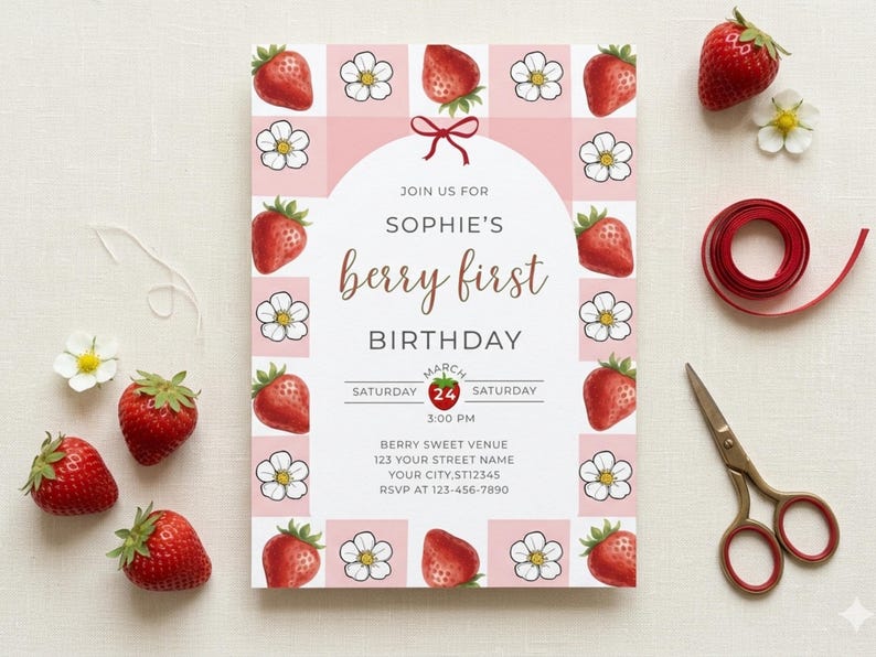 Strawberry 1st Birthday Invitation Template, Berry First Birthday Party ...