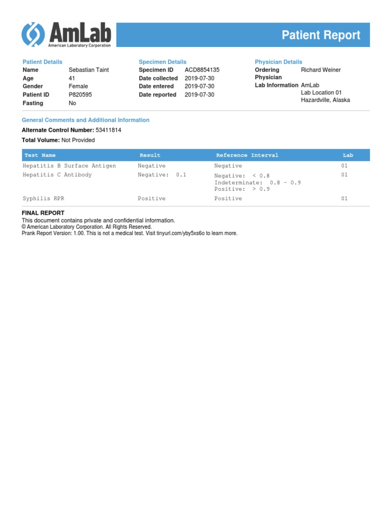 Clinical diagnostics 728 Patient Report | Lab Testing Results