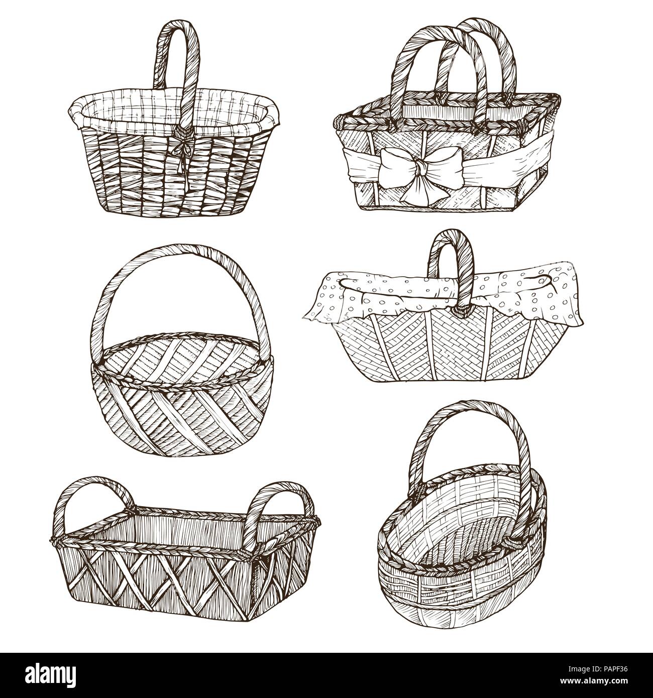 Hand drawn sketch of wicker basket. Engraved style vector illustration ...