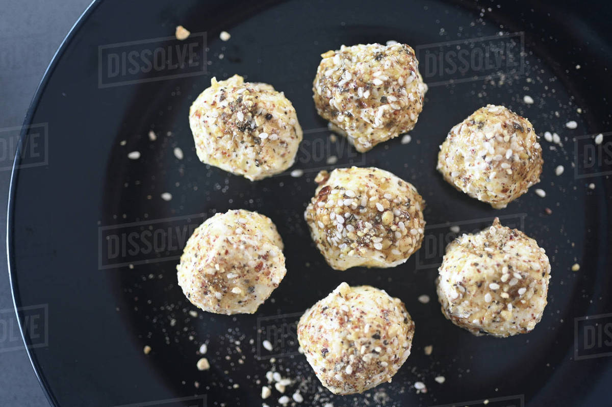 Above view of Labane yogurt cheese balls served on a black plate ...