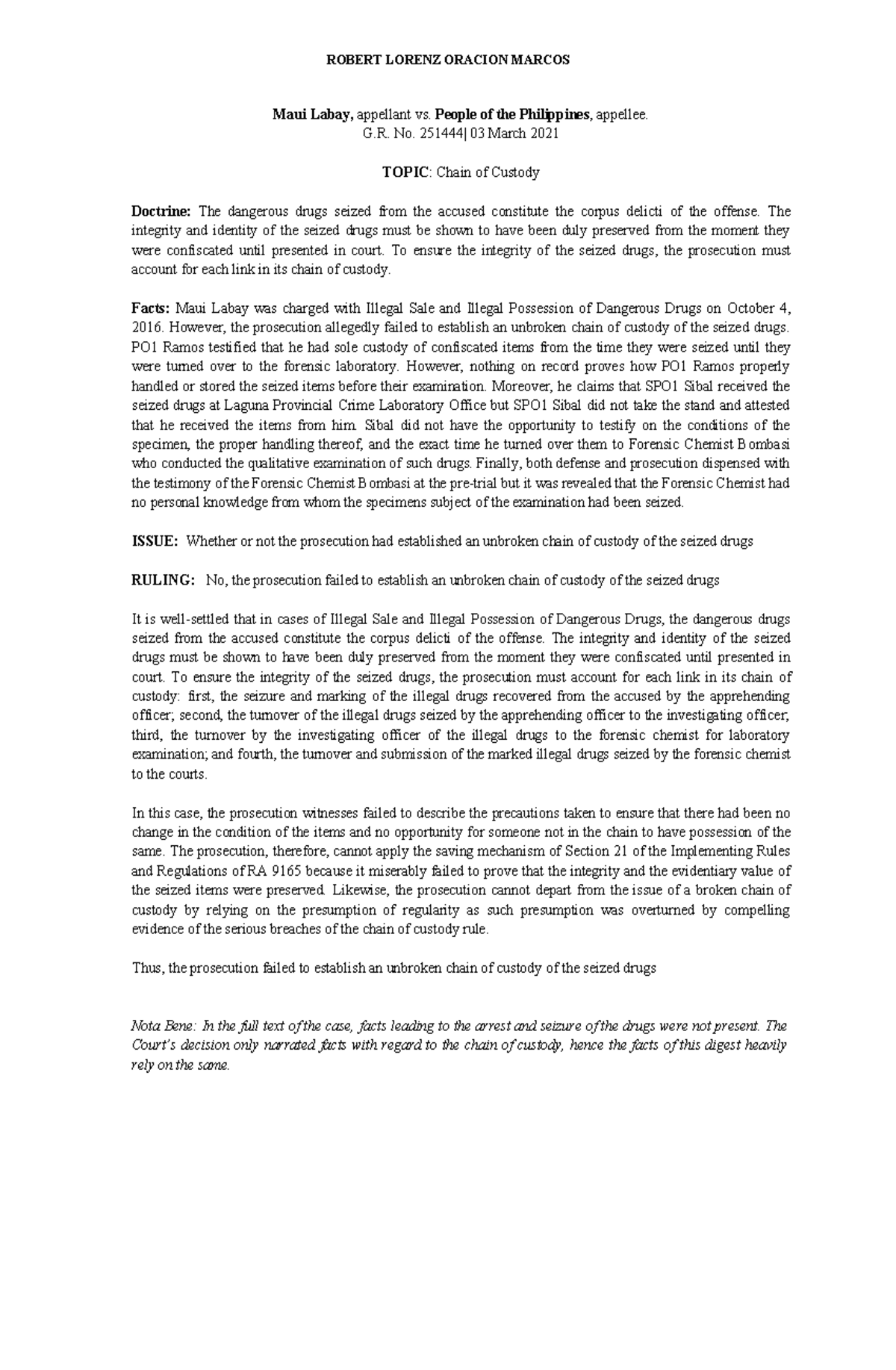 People vs. Labay Marcos: Analysis of Chain of Custody Issues - Studocu