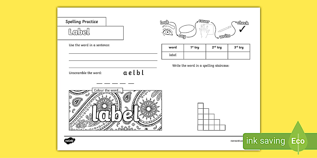 Label Spelling Practice Worksheet (teacher made) - Twinkl