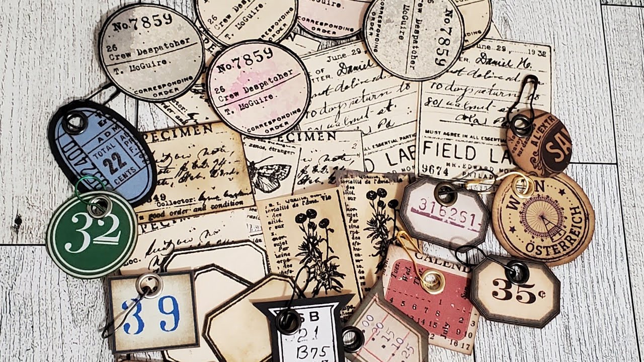 Label Dangles & Ephemera, Words and Numbers, Aged Labels, 6 Colour-ways ...