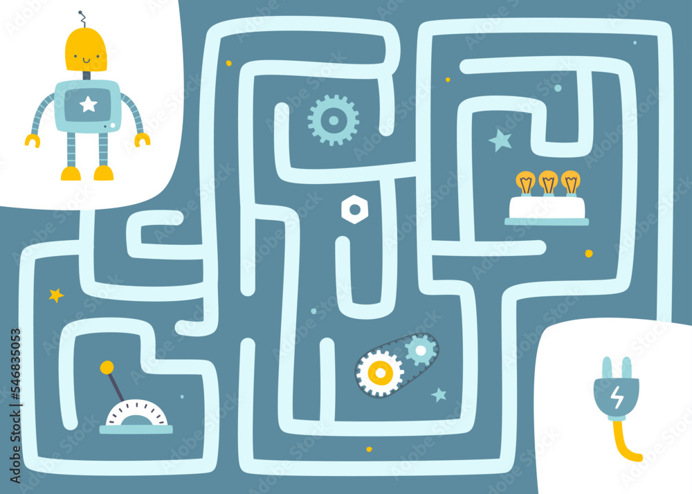 Mini labyrinth game with cute robot for children. Vector maze with ...