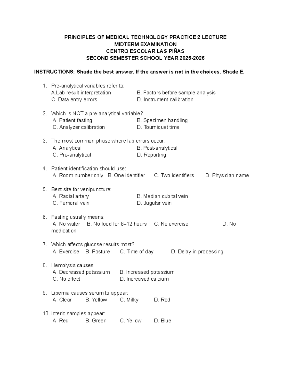 PRINCIPLES OF MEDICAL LABORATORY SCIENCE PRACTICE 2 (LECTURE) Midterm ...
