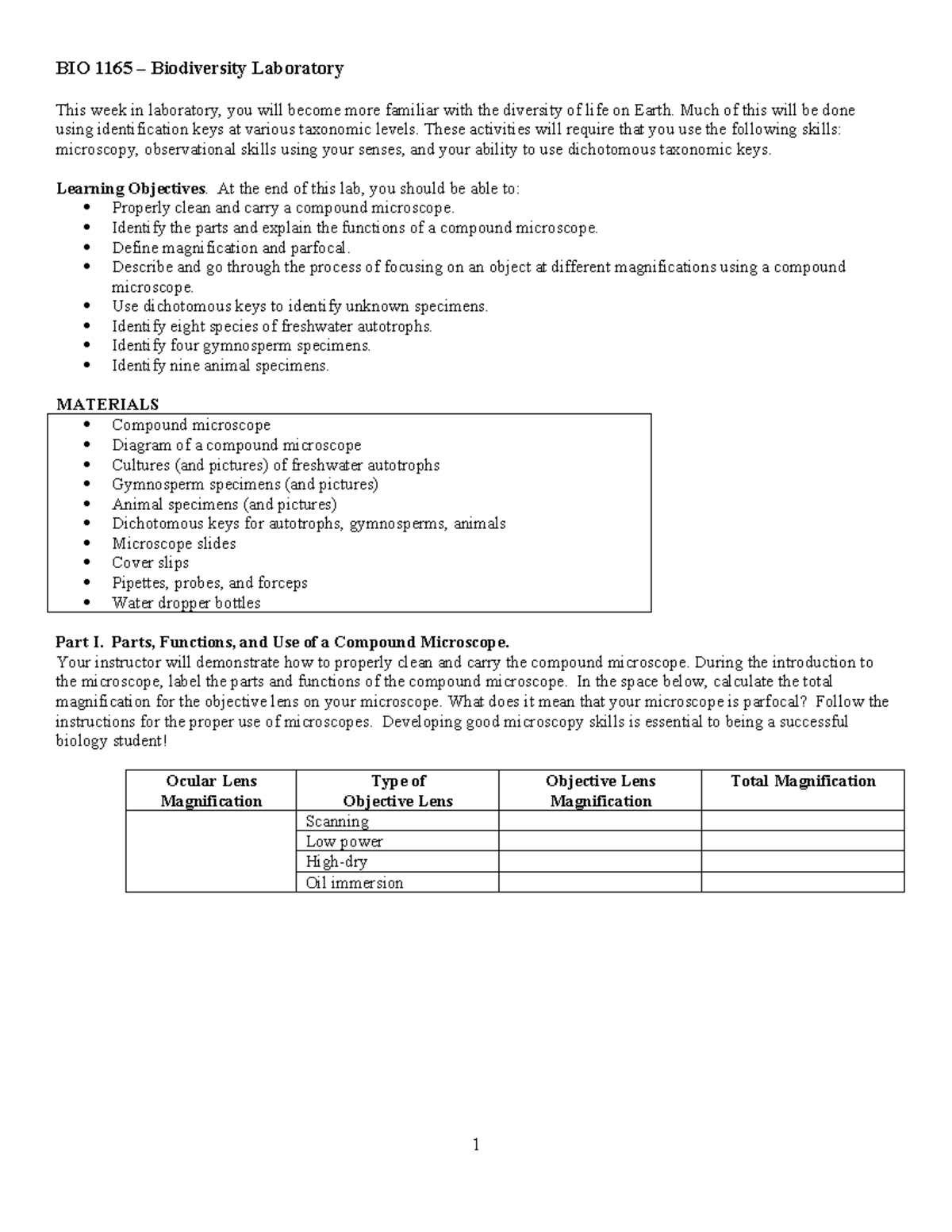 BIO 1165 Biodiversity Lab: Microscopy & Species Identification - Studocu