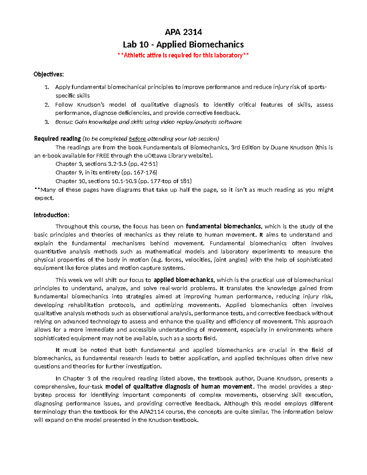 APA 2314 Lab 10: Applied Biomechanics Techniques and Observational ...