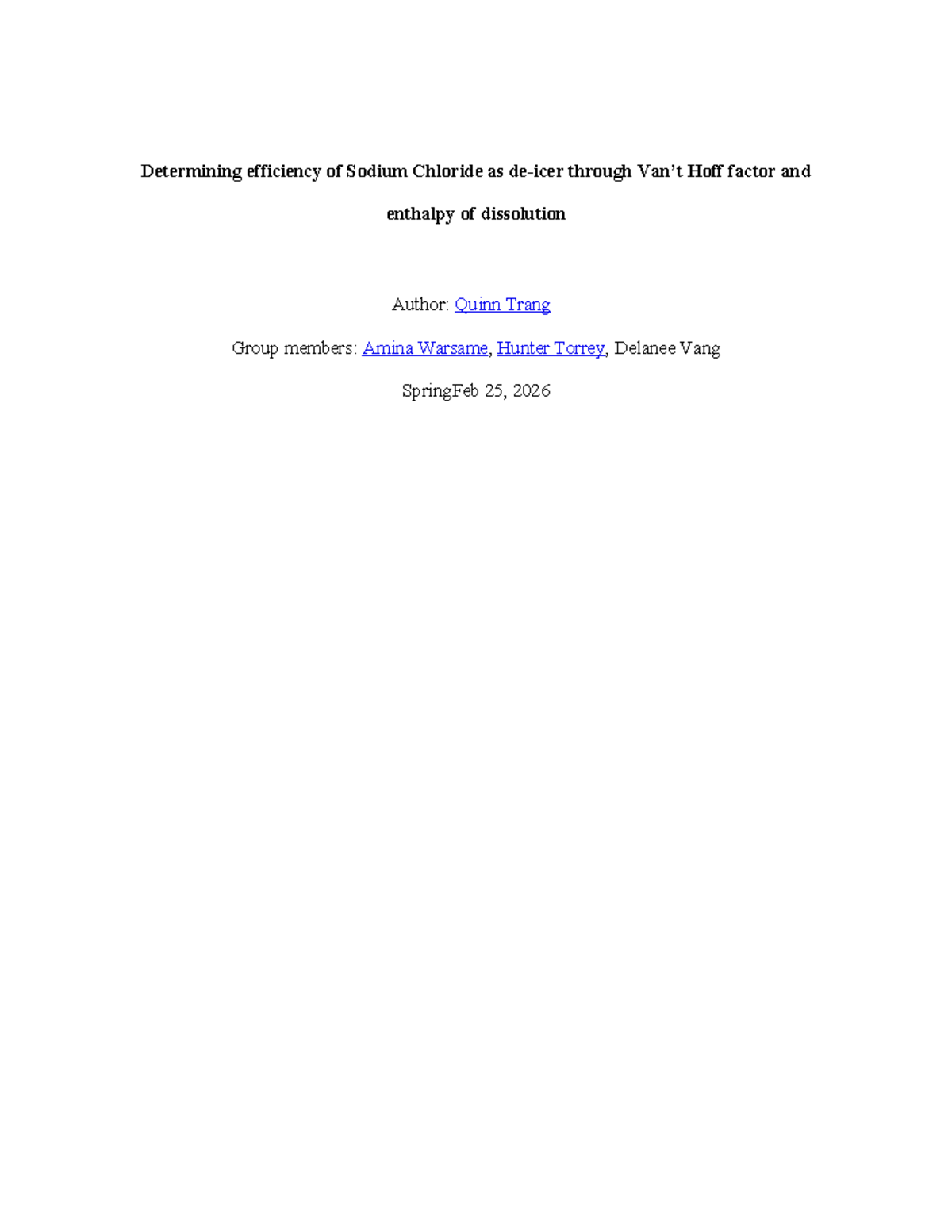 CHEM 1066 Lab Report: Evaluating Sodium Chloride as a Deicer - Studocu